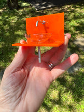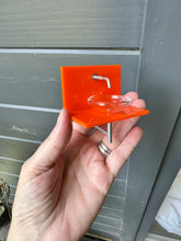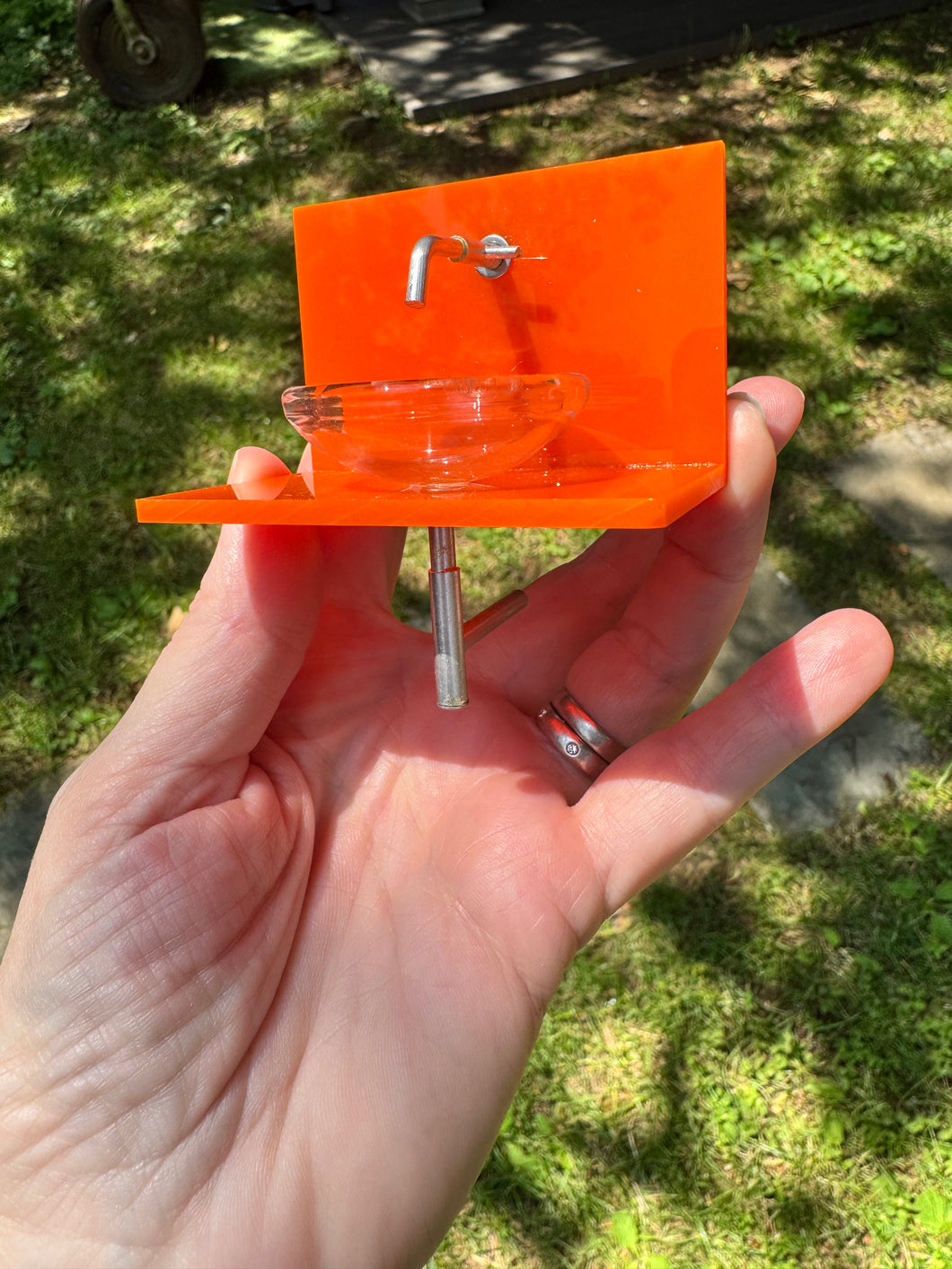 These vanity units are made from acrylic, with a custom made glass vanity sink made by Ray Storey. The tap and waste pipe are made from aluminium in a modern style.